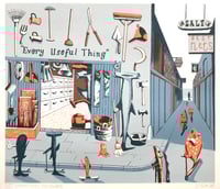This print is one in an ongoing series of screen prints based on the idea of a coastal town populated by fish. This is the local hardware shop opening up for the day. Young fish are on their way to school.